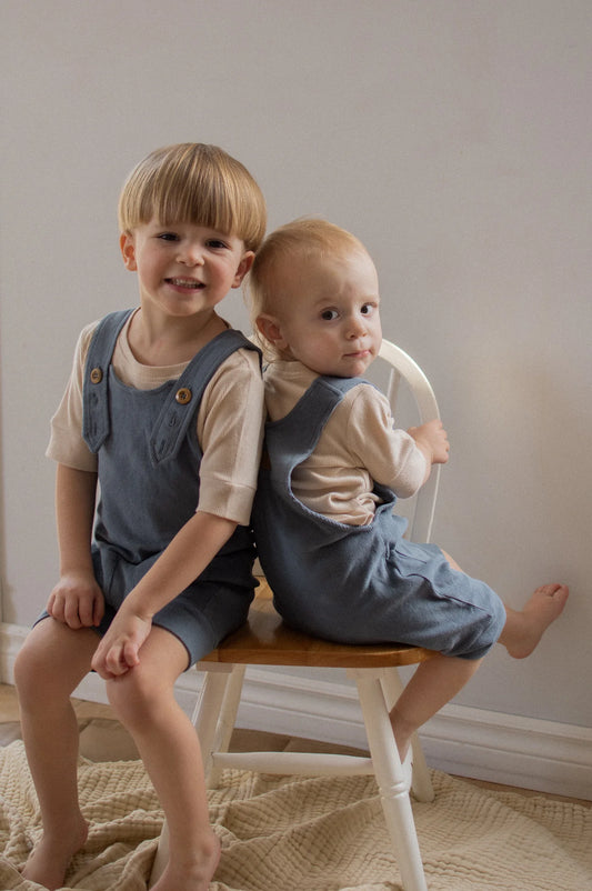 Salopette évolutive courte bleu pastel en bambou côtelé