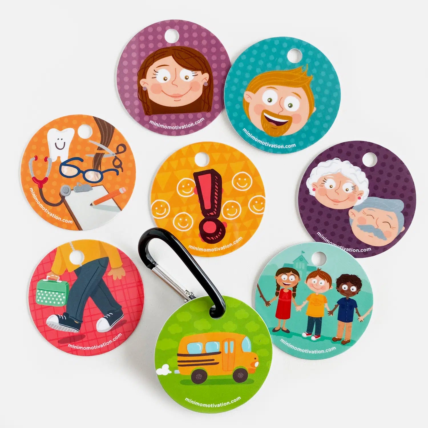 - Accroche la pastille au sac à dos de ton enfant avec le mousqueton inclus