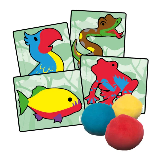 COMPREND : Trois pots de 100 g de pâte à modeler parfumée : rouge cerise, jaune citron, bleu barbe à papa, quatre cartes d'animaux double face de 5,5 x 4,5 pouces : Pygmée Hippopotame - Python réticulé - Chimpanzé - Piranha - Tigre - Fourmi coupe-feuille - Ara - Grenouille à flèches empoisonnées, un dépliant d'information sur les animaux avec un tableau de mélange de couleurs.