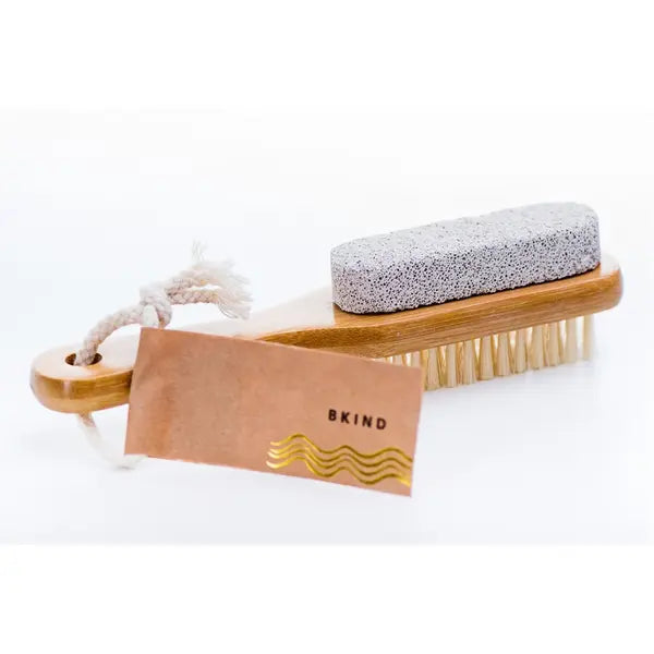 D'un côté, il y a une pierre ponce, qui provient de roches volcaniques en fusion. Cette pierre permet de réduire l'accumulation des peaux mortes sur les pieds. De l'autre côté, il y a une brosse en poils de polypropylène, qui est le mélange parfait entre douceur et rigidité. Elle nettoiera vos pieds en douceur.
