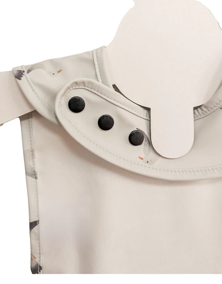 Fait de polyester recyclé à 100% et imperméable, il est résistant aux taches et aux odeurs. Grâce à ses trois boutons pressions, ce joli bavoir reste bien en place lors des repas et s'ajuste lorsque votre enfant grandira.