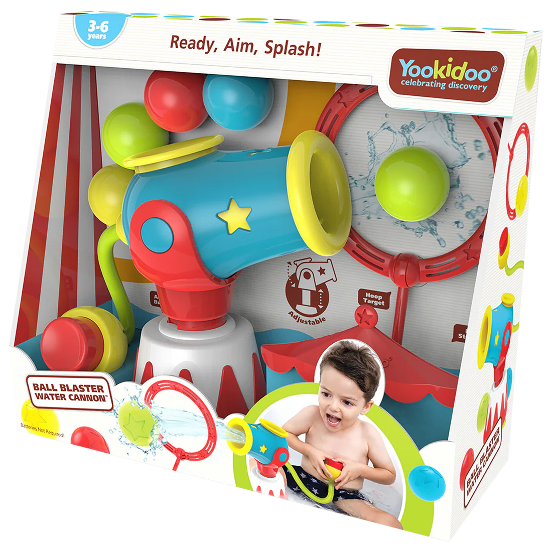 Chargez le boulet de canon et faites-le exploser à travers le cerceau ou lancez un jet d'eau. L'heure du bain sera désormais une explosion avec un canon de cirque qui prend vie et qui convient parfaitement à la baignoire. À vos marques, visez, éclaboussez !