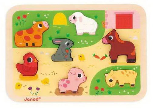 Découvrez le Chunky puzzle La ferme de Janod, un puzzle d'encastrement en bois avec 7 grosses pièces à replacer dès 18 mois.