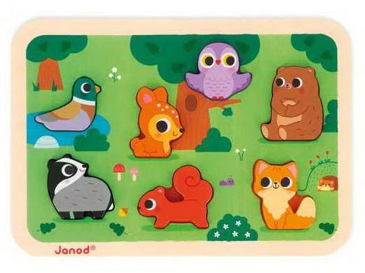 Découvrez le Chunky puzzle La forêt de Janod, un puzzle d'encastrement en bois avec 7 grosses pièces à replacer dès 18 mois.