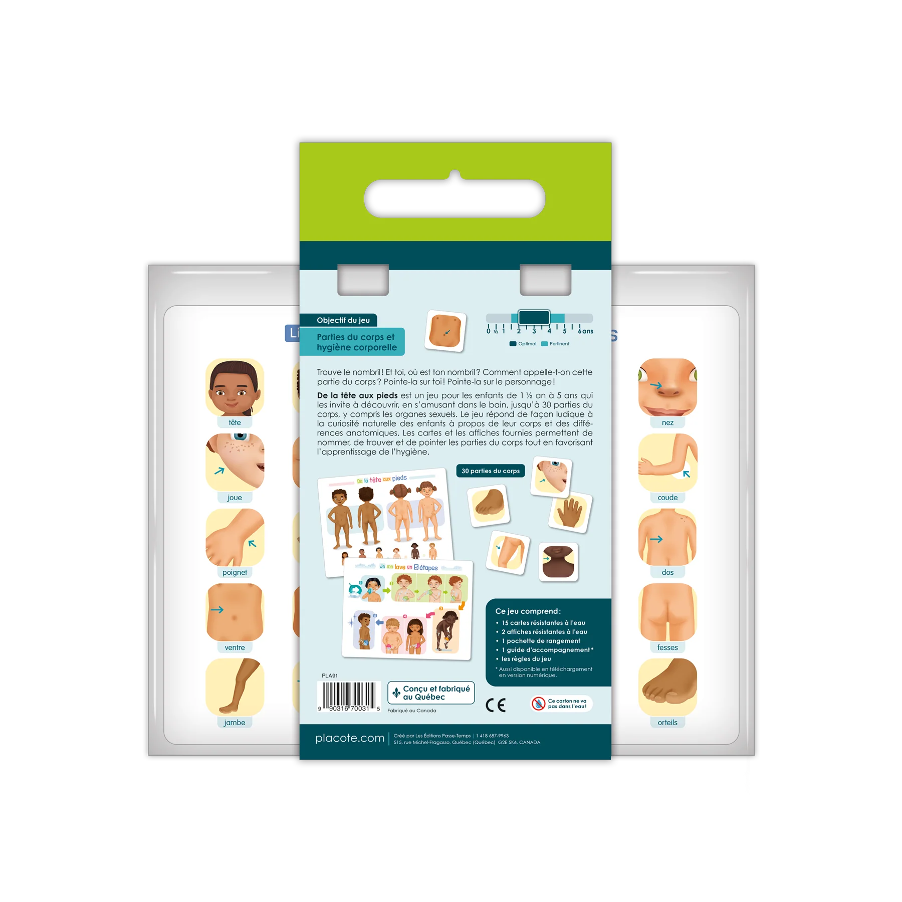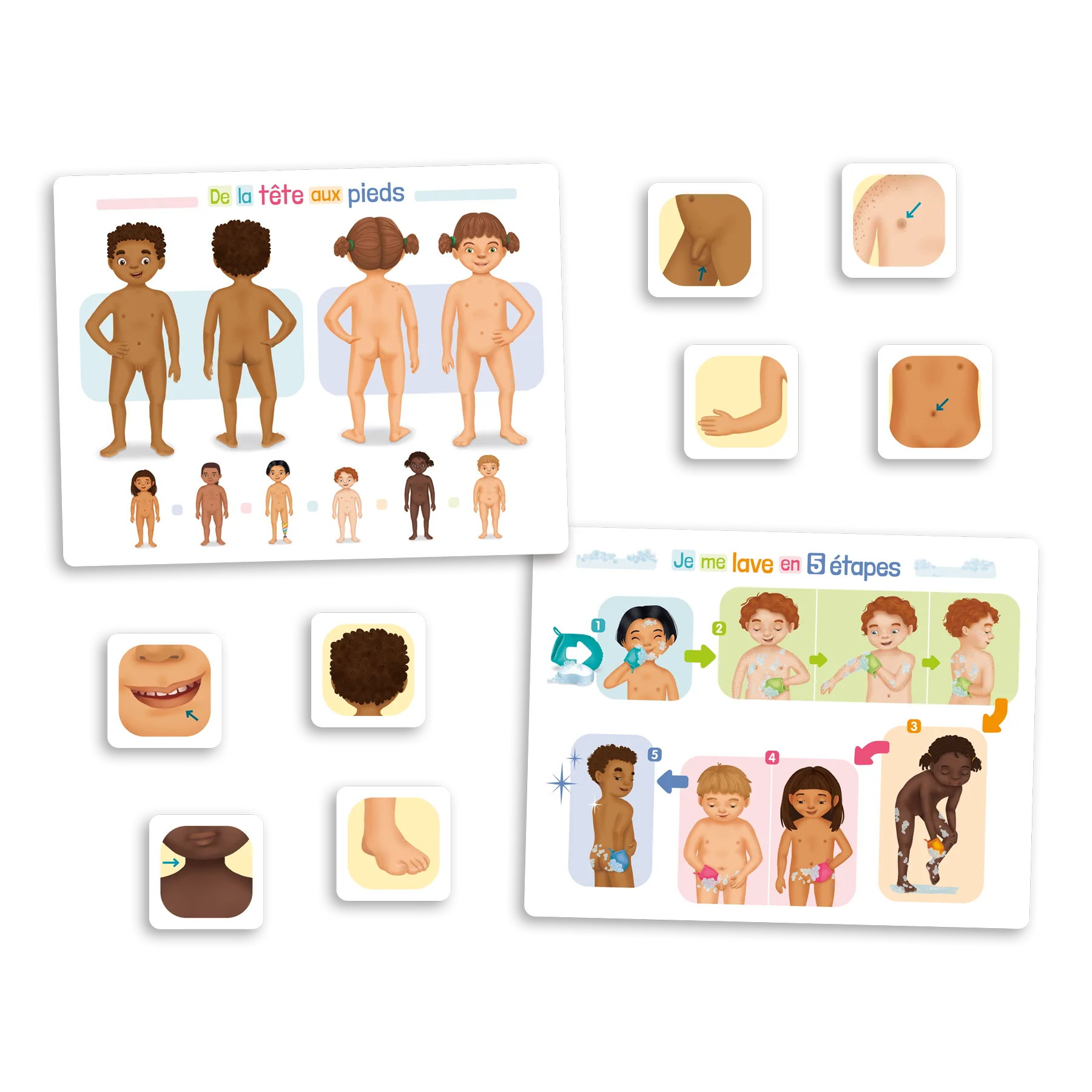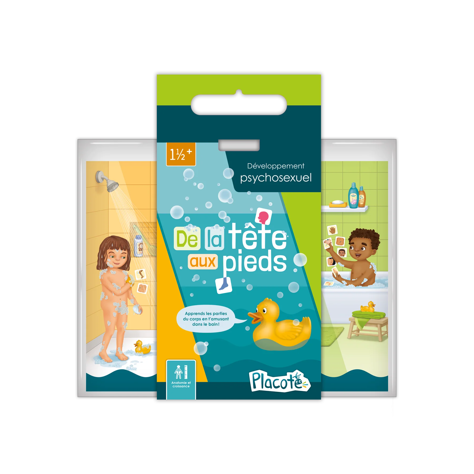 De la tête aux pieds est un jeu pour les enfants de 1½ an à 5 ans qui les invite à découvrir, en s'amusant dans le bain, jusqu'à 30 parties du corps, y compris les organes sexuels. Le jeu répond de façon ludique à la curiosité naturelle des enfants à propos de leur corps et des différences anatomiques. Les cartes et les affiches fournies permettent de nommer, de trouver et de pointer les parties du corps tout en favorisant l'apprentissage de l'hygiène.