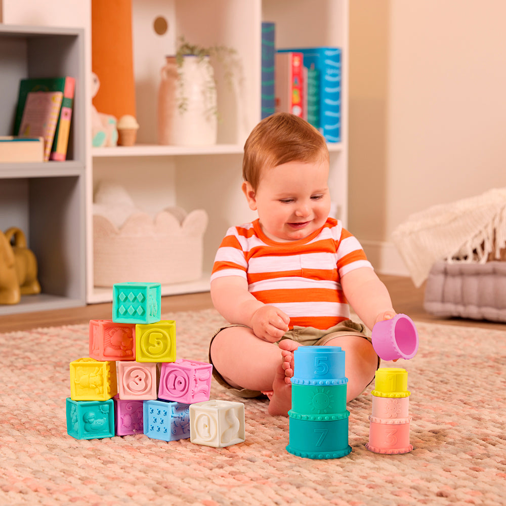 Construisez, empilez, pressez et versez avec le coffret Stackin' Squishies de B. Toys ! Ce coffret souple et sensoriel de 17 pièces regorge de couleurs douces et d'activités ludiques pour les bébés. Les blocs texturés présentent des motifs avec des chiffres, des formes et des animaux mignons : 60 faces de jeu sensoriel ! Et les gobelets moelleux à empiler sont prêts à s'amuser dans la chambre de bébé ou dans le bain, grâce à leurs petits trous qui les rendent dégoulinants. Chacun est même orné d'une jolie illustration que les parents peuvent utiliser pour aider les tout-petits à apprendre de nouveaux mots et à utiliser les gobelets ! Non seulement les enfants adoreront construire avec les blocs et empiler les gobelets, mais ils sont également sans danger pour les petits grignotages et leur permettront d'expérimenter la relation de cause à effet et de développer leur coordination œil-main.