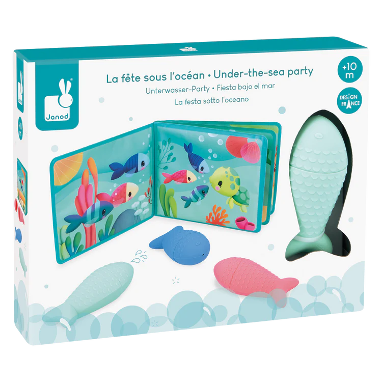 Le Livre de Bain La Fête Sous l’Océan de Janod est un jouet aquatique destiné aux enfants dès 10 mois. Ce coffret comprend un livre en forme de baleine et 3 gicleurs poissons. L’histoire suit une bande d’amies marines qui partent faire la fête au fond de l’océan, rencontrant tortues, poissons clowns, crevettes et étoiles de mer. Les gicleurs éclaboussent d’eau lorsqu’on appuie sur leur ventre, ajoutant une dimension ludique au bain. Pratiques, ils s’ouvrent pour un nettoyage facile. Ce jouet stimule l’imagination, la motricité fine et la découverte des animaux marins. Dimensions du livre : 18 x 15 x 2,5 cm. Fabriqué en silicone et EVA.