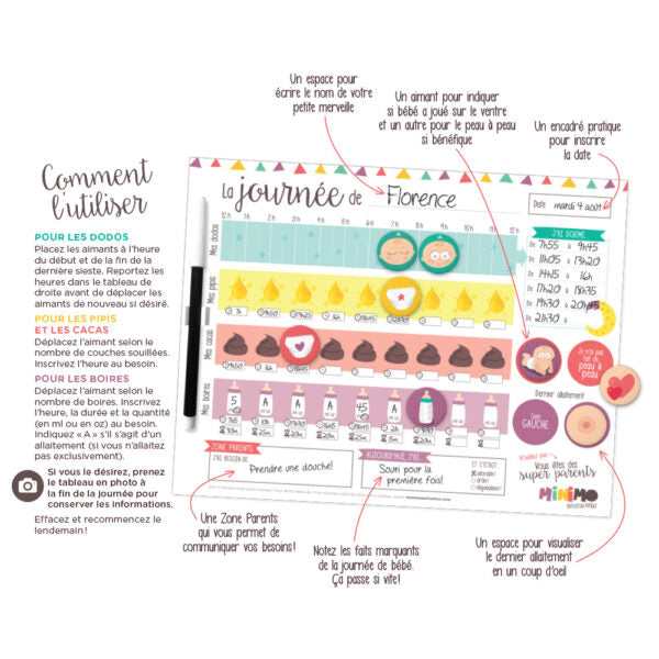 Déplace l’aimant selon le nombre de boires. Inscris l’heure, la durée et la quantité (en ml ou en oz) au besoin. Indique « A » s’il s’agit d’un allaitement (si vous n’allaitez pas exclusivement).