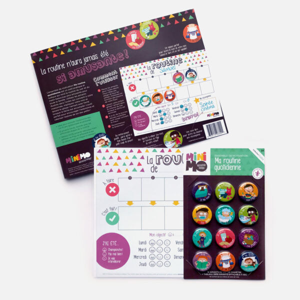 Utilise les aimants dans l’ordre qui convient à ta famille, implique ton mini et laisse-le glisser l’aimant avec fierté lorsque la tâche est accomplie. Une façon pratique et ludique de faire de la routine un jeu et de stimuler l’autonomie de tes minis!
