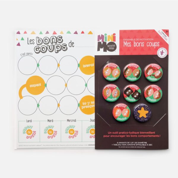 L’ensemble de motivation Mes bons coups est un outil pratique et ludique pour aider les enfants à rester motivés à faire des bonnes actions et les encourager à conserver un comportement positif. Fixe un objectif à adopter et laisse ton enfant avancer lui-même l’étoile avec fierté après avoir fait un bon coup! L’outil parfait pour encourager l’autonomie et valoriser l’estime de soi des petits!