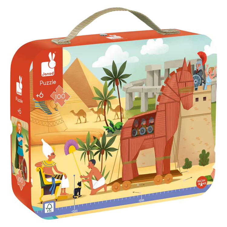 Prêts pour un voyage dans le temps ? Plongez dans l'ère des premiers grands empires avec cette frise illustrée de 100 pièces sur le thème de l'Antiquité et de la Mythologie, adaptée aux enfants dès 6 ans. Ce puzzle panoramique de 100 x 20 cm offre une immersion totale dans cette période de l'Histoire qui a façonné les bases de notre civilisation. Les pièces sont parfaitement adaptées aux petites mains des enfants de 6 ans et permettent de développer leur motricité fine. Ce puzzle éducatif est aussi idéal pour stimuler la concentration et la patience. Il favorise l'apprentissage de l'histoire de manière ludique ! Le poster fourni peut être utilisé comme modèle et contient également des informations historiques pour appuyer le côté pédagogique du casse-tête. La frise est ainsi la feuille de route qui guide l'enfant dans la découverte de cette ère faite de mythes et de légendes. Il pourra ensuite se servir de ce puzzle comme d'un cherche et trouve et ainsi se mettre au défi de repérer tous les détails dont fourmille notre casse-tête, du plus gros comme le cheval de Troie, au plus petit comme les chats vénérés en ancienne Égypte. Le tout est vendu dans une jolie valisette avec poignée, pratique pour le rangement et le transport. Avec ce puzzle, les enfants et les adultes peuvent partager un moment de calme et de sérénité : c'est l'occasion d'apprendre et de stimuler l'imagination des plus petits. Alors, prêts pour un voyage à travers le temps ? Fabriqué en France, ce puzzle est réalisé avec des encres végétales et du carton FSC™.