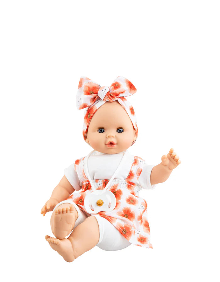 - Vêtements inclus (ensemble salopette avec motifs floraux et bandeau floral)