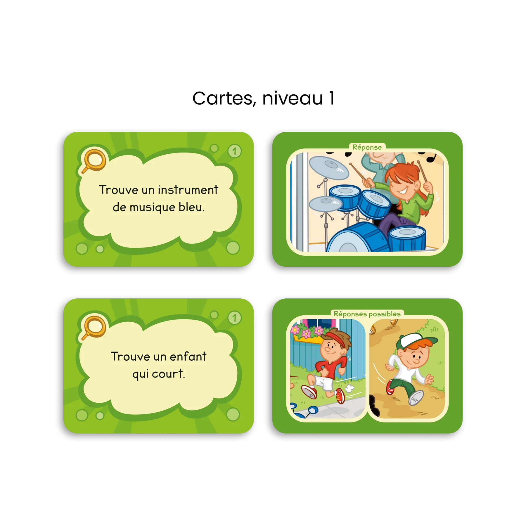 Pour soutenir l'enfant dans son développement cognitif et langagier, il est pertinent de l'exposer à des consignes de formes et de longueurs variées ainsi qu'à différentes catégories d'éléments. C'est ce que propose le jeu Que le meilleur trouve!, dans lequel les enfants doivent comprendre des consignes faisant intervenir différentes catégories (moyens de transport, instruments de musique, personnes, objets, etc.) puis tenter d'être le joueur le plus rapide à repérer des éléments dans une scène illustrée.