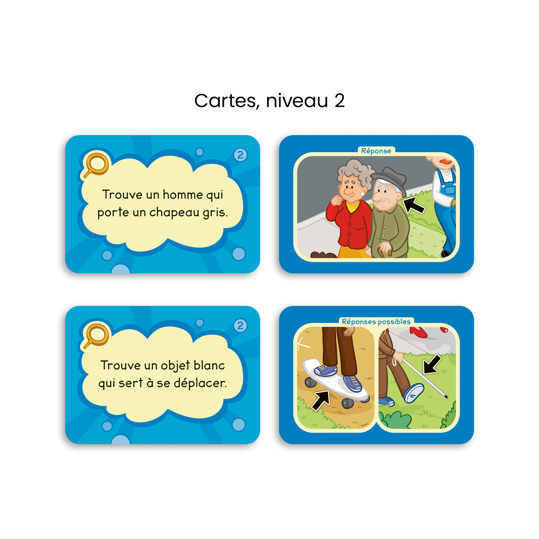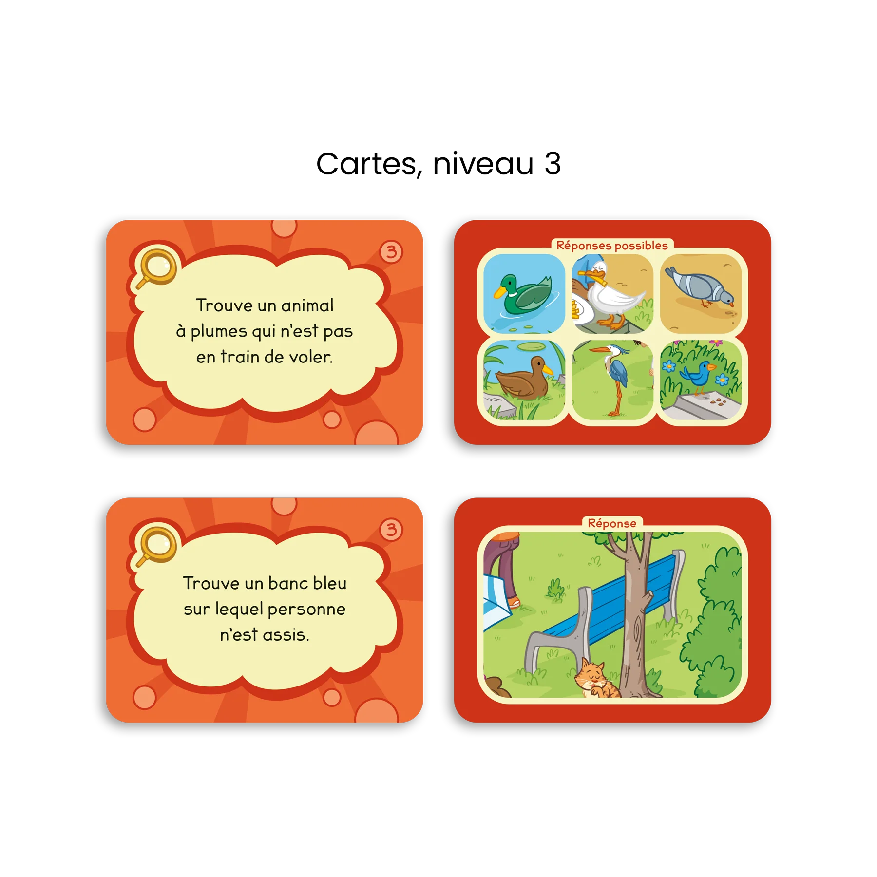 Le jeu propose trois niveaux de difficulté avec des consignes de plus en plus complexes. Il offre ainsi l'occasion à l'enfant de s'exercer à comprendre différents types de consignes qui font intervenir des catégories variées.