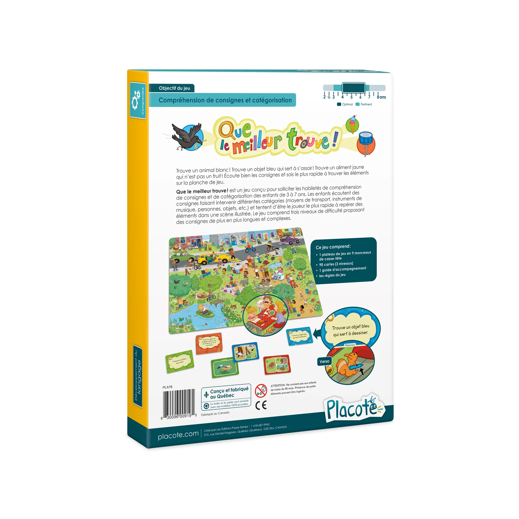 Que le meilleur trouve! est un jeu conçu pour solliciter les habiletés de compréhension de consignes et de catégorisation des enfants de 3 ans à 7 ans. Les enfants écoutent des consignes faisant intervenir différentes catégories (moyens de transport, instruments de musique, personnes, objets, etc.) et tentent d'être le joueur le plus rapide à repérer des éléments dans une scène illustrée. Le jeu comprend trois niveaux de difficulté proposant des consignes de plus en plus longues et complexes.