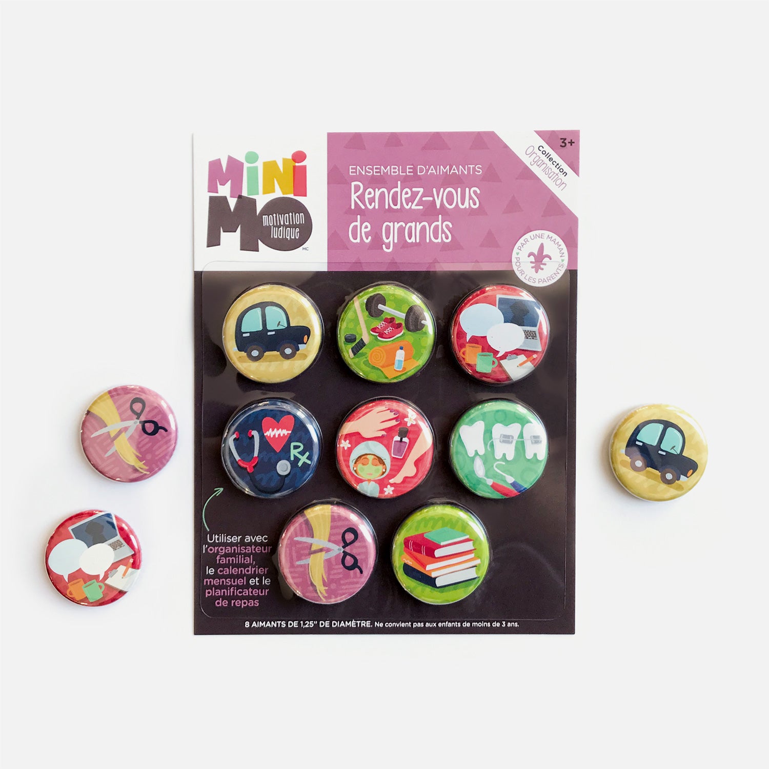 L’ensemble d’aimants Rendez-vous de grands est un outil pratico-ludique qui te permet d’afficher de façon visuelle tous tes rendez-vous sur tes outils Minimo préférés. Même les affaires plates comme le dentiste et le garage… parce que les aimants, c’est pas juste pour les enfants!