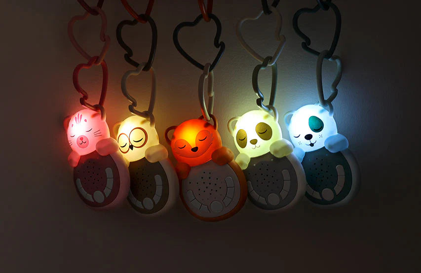 Une veilleuse tout-en-un ! Un rêve pour les parents, chaque personnage est une veilleuse nomade sonore et lumineuse ! Aidez à calmer les petits avec des couleurs et des sons réconfortants, car cette adorable animal est équipé d'une veilleuse intégrée ainsi que des mélodies et sons apaisants. Assez compact pour être emporté partout où vous allez, Sweet Dreamz™ on the Go est livré avec un clip en forme de cœur d'une taille pratique qui se fixe facilement presque partout !