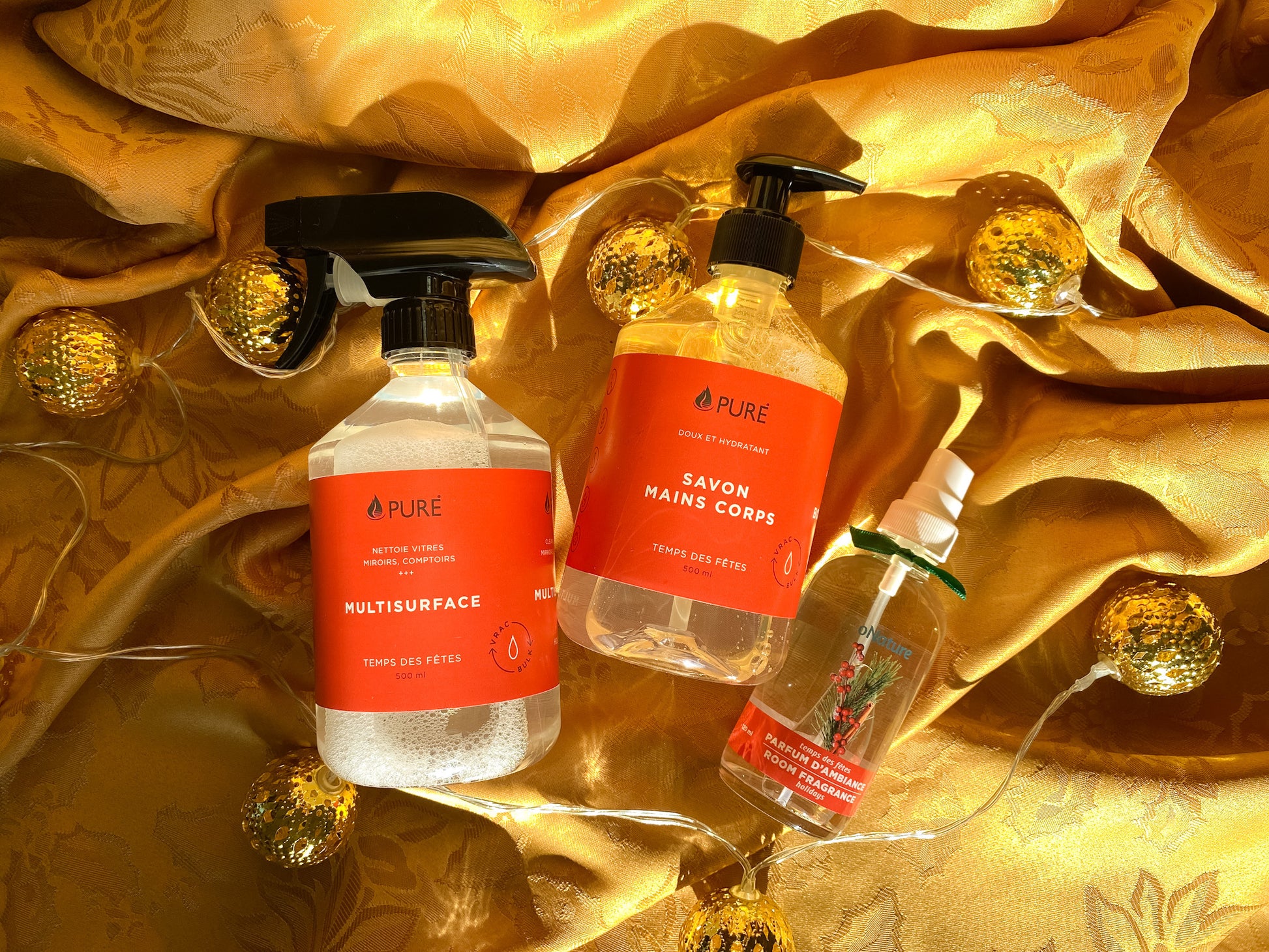 À l’arôme de canneberge, de pin et de cannelle. Inclus le savon mains et corps 500ml, le multi-surface 500ml et le parfum d’ambiance 120ml.
