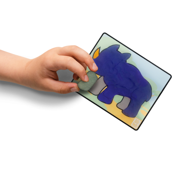 - Trois pots de 100g de pâte à modeler parfumée : rouge cerise, jaune citron, bleu barbe à papa, quatre cartes d'animaux recto-verso de 5,5 x 4,5 pouces : Hippopotame nain - Python réticulé - Chimpanzé - Piranha - Tigre - Fourmi coupeuse de feuilles - Araignée - Grenouille empoisonnée, une brochure d'information sur les animaux avec un tableau de mélange des couleurs.