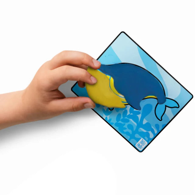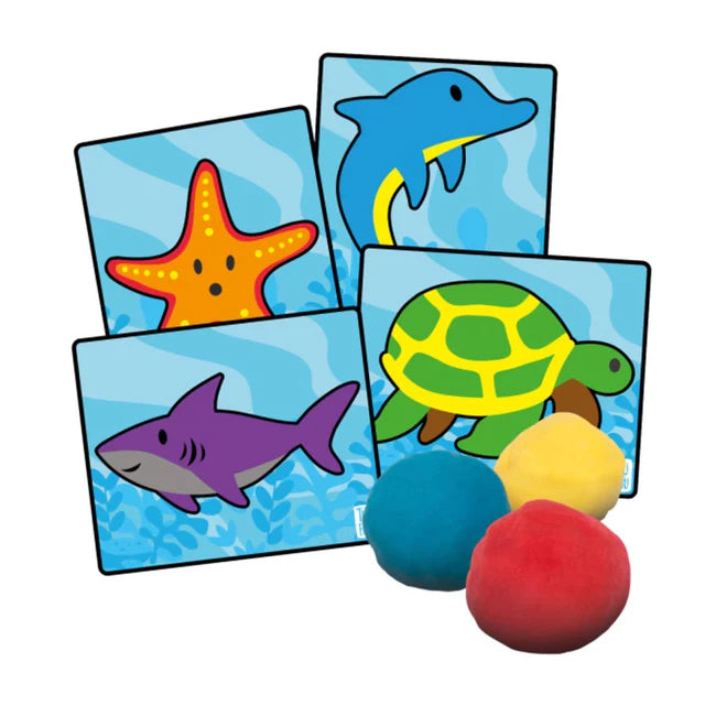 COMPREND Trois pots de 100 g de pâte à modeler parfumée : rouge cerise, jaune citron, bleu barbe à papa, quatre cartes d'animaux double face de 5,5 x 4,5 pouces : Tortue verte - Poisson-perroquet - Étoile de mer - Requin - Baleine bleue - Poulpe - Dauphin - Corail, un dépliant d'information sur les animaux avec un tableau de mélange de couleurs.
